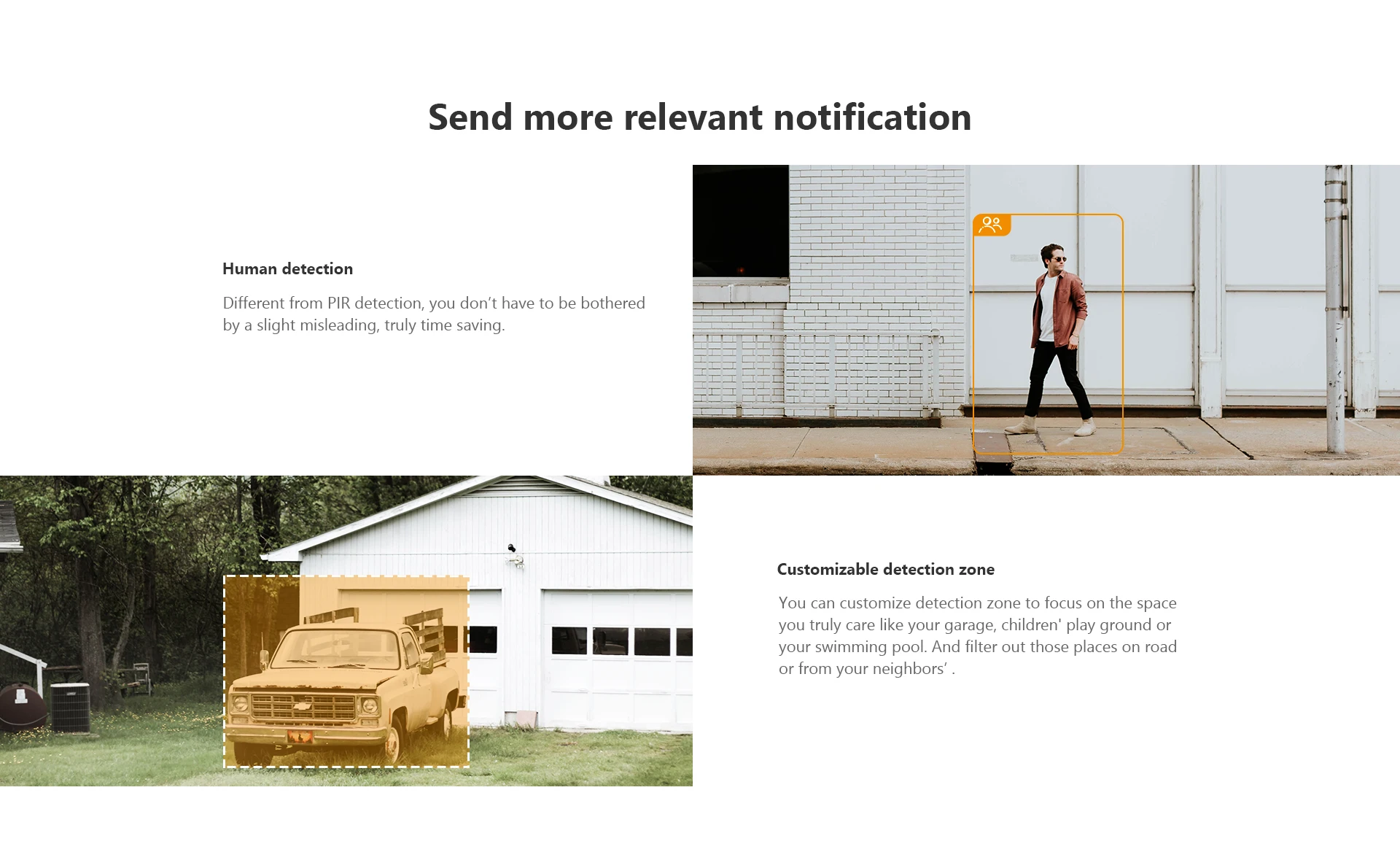 يمكنك تخصيص منطقة الكشف للتركيز على المساحة التي تهتم بها حقًا مثل المرآب الخاص بك أو ملعب الأطفال أو حمام السباحة الخاص بك. وقم بتصفية تلك الأماكن على الطريق أو من أماكن جيرانك.