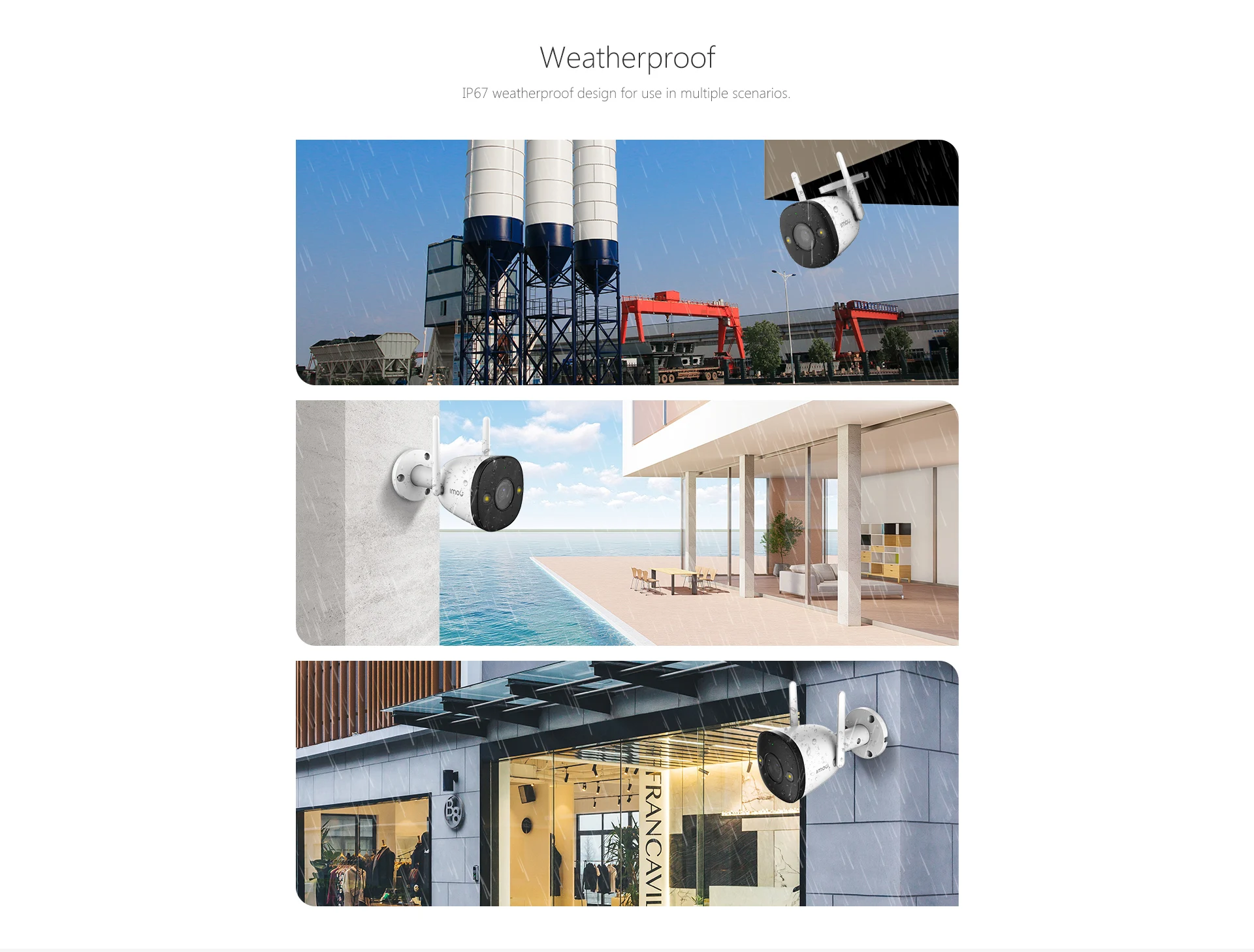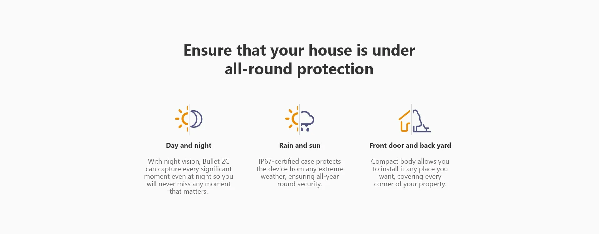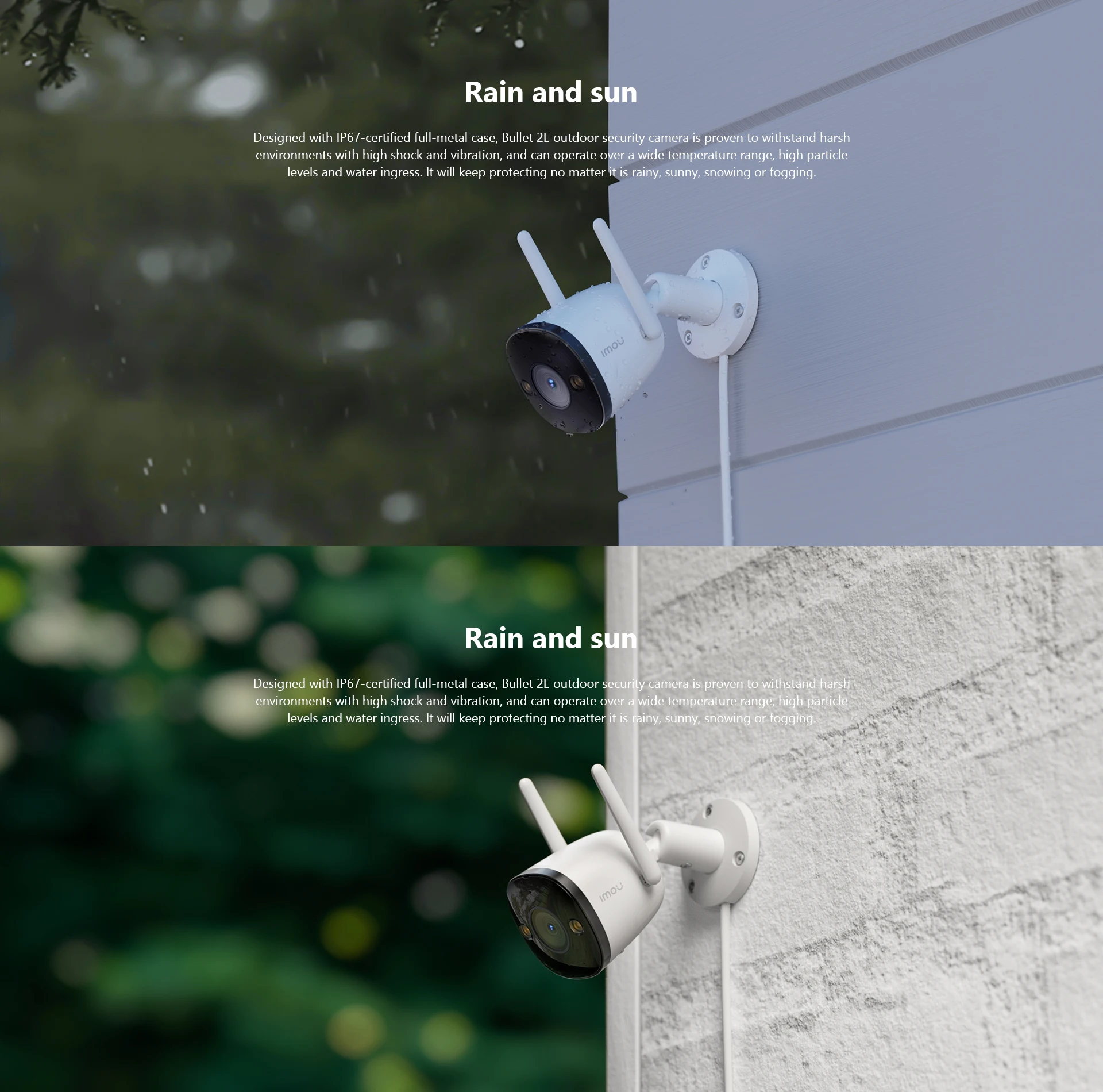 تم تصميم الكاميرا الخارجية Bullet 2E المصممة بحافظة معدنية بالكامل معتمدة من IP67 ، وقد أثبتت قدرتها على تحمل البيئات القاسية ذات الصدمات والاهتزازات العالية ، ومواصفات درجة الحرارة الواسعة ، والمحتوى العالي من الجسيمات ودخول المياه. سوف تحافظ على منزلك على مدار السنة.